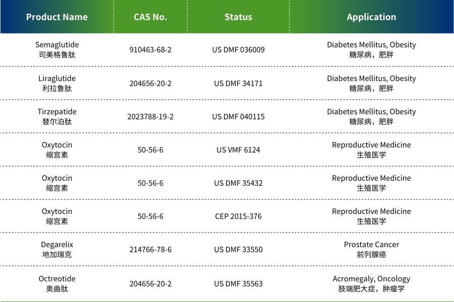Our product portfolio includes dozens of peptide APIs. Flagship products such as Semaglutide and Terlipressin have successfully completed U.S. FDA DMF filing.